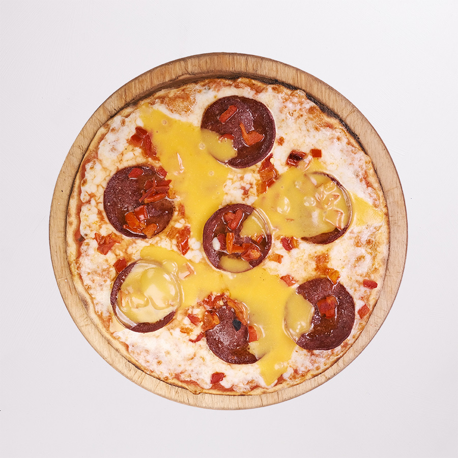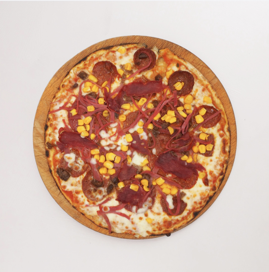 Domates Sos, Mozzarella Peyniri, Jambon, Sucuk, Pepperoni, Kavurma, Pastırma, Mısır