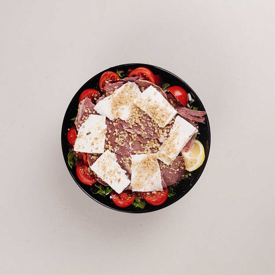 Lolorosso, Roka, Aysberg, Füme Kaburga, Beyaz Peynir, Ceviz, Cherry Domates, Limon