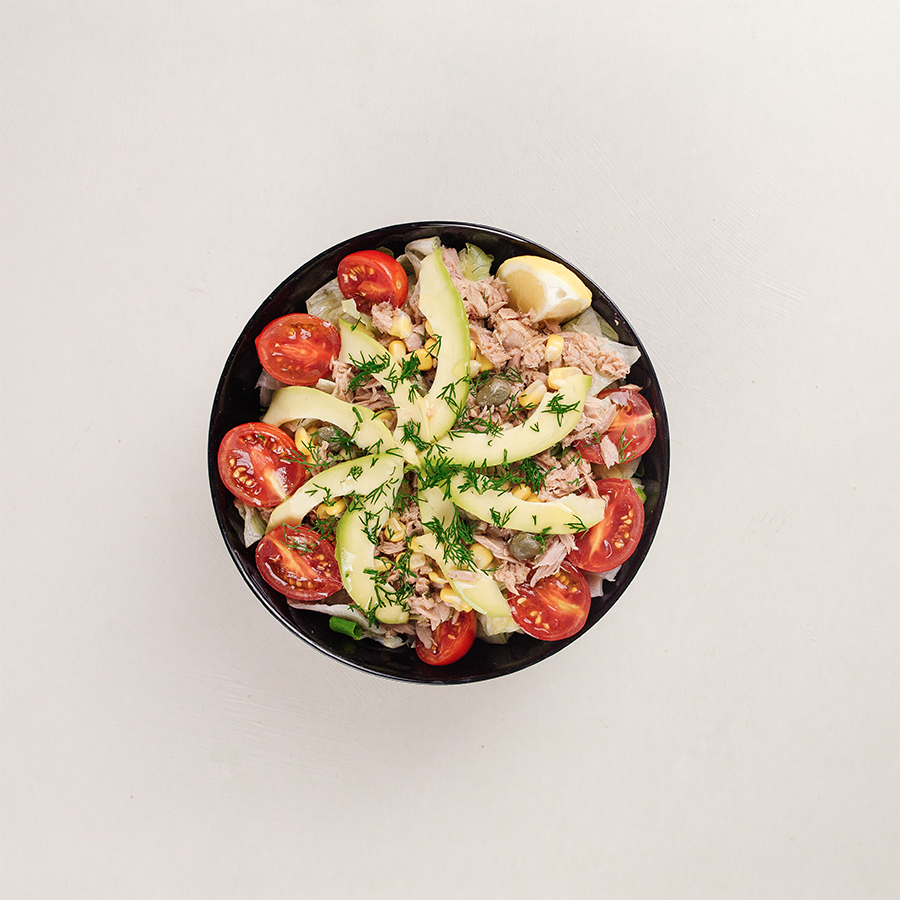 Ton Balığı, Cherry Domates, Limon, Avokado, Taze Soğan, Dereotu, Kapari, Ceviz, Iceberg Marul, Lolorosso, Roka